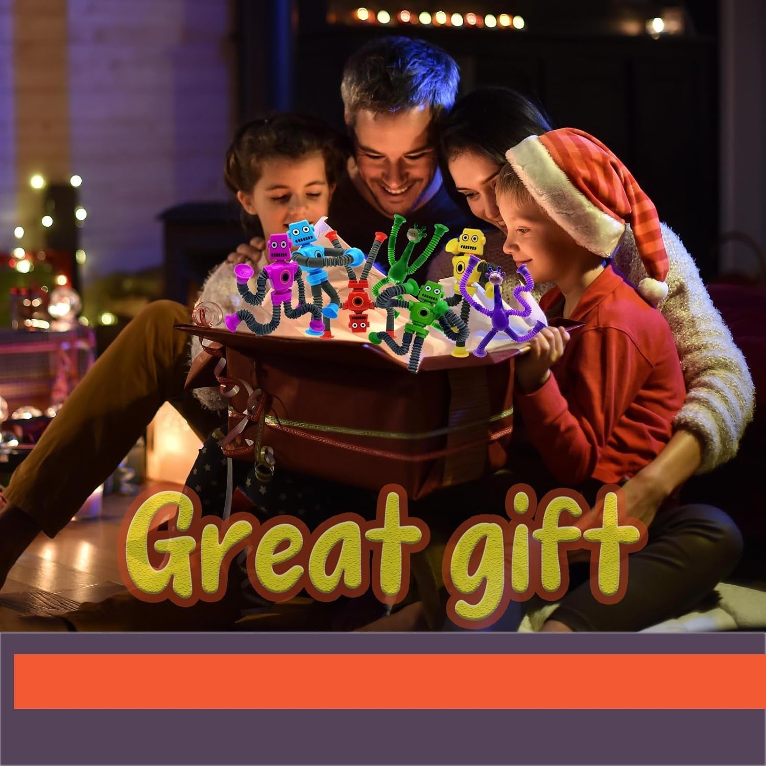 This fun suction cup robot toy features stretchable pop tubes that bend, twist, and make a satisfying popping sound for engaging sensory play. The suction base sticks to smooth surfaces like windows, mirrors, and tiles, offering endless play possibilities. Perfect for kids' party favors, classroom prizes, stocking stuffers, and goodie bags. Great for reducing stress, boosting creativity, and improving hand-eye coordination. Safe, durable, and ideal for kids of all ages.