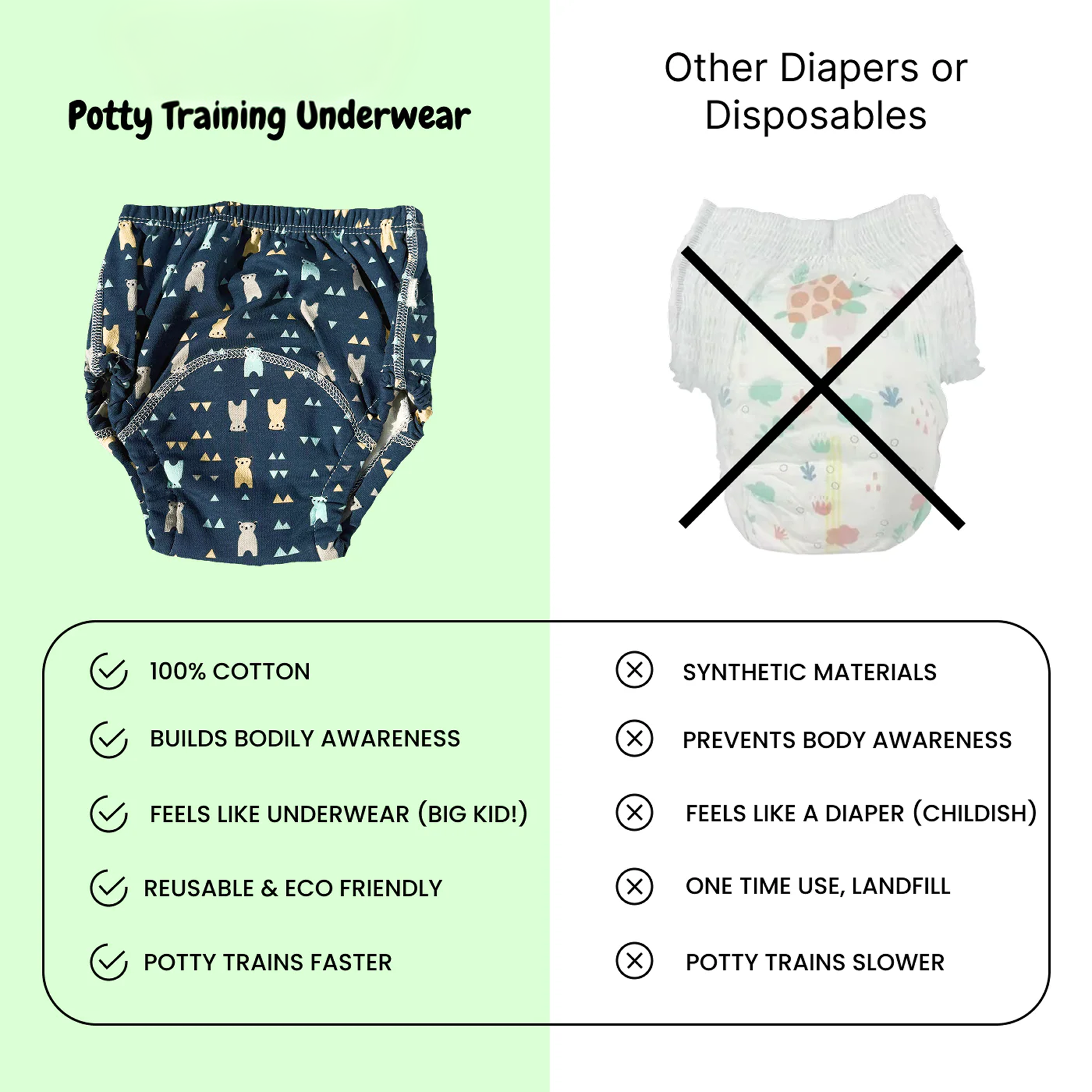 Disposables work against potty training success. Potty Training Underwear helps you gets results in weeks, not months.