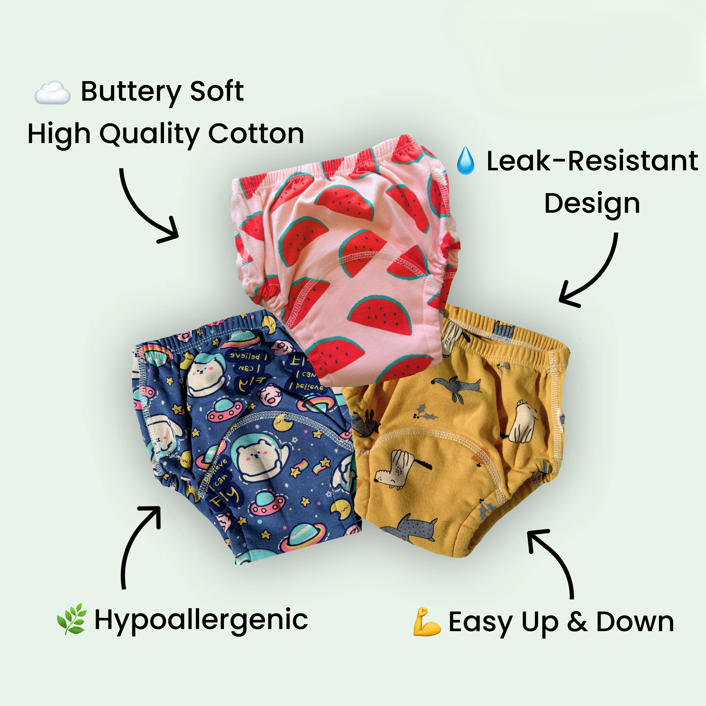 We use a specialized 3-layer absorption system that lets toddlers feel just enough wetness to trigger awareness, without soaking through to clothes or furniture.